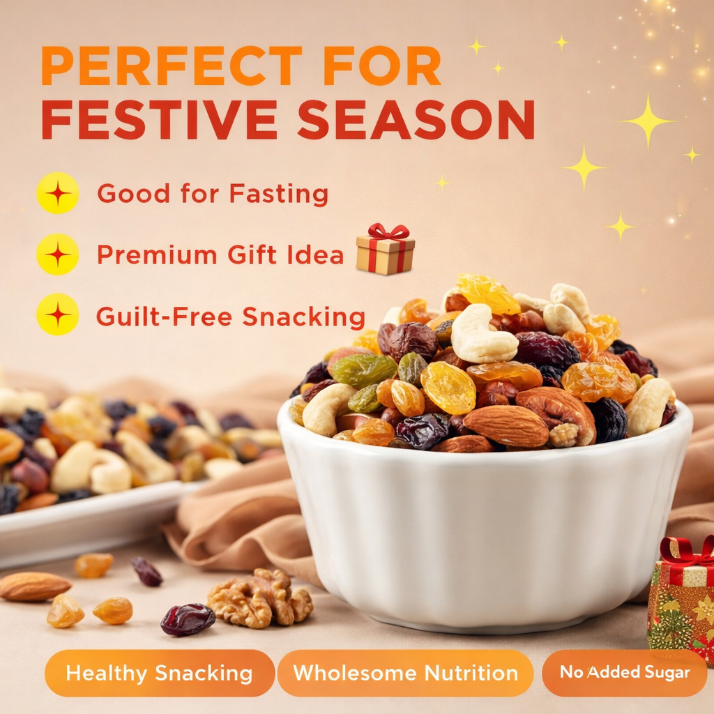 Nirmal Foodghar brings you a Premium Dry Fruits Mix crafted with handpicked, high-quality nuts and dried fruits to deliver the perfect balance of taste and nutrition. These healthy mixed nuts combo is ideal for daily consumption, gifting, fasting, or festive occasions.